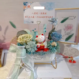 【喜滋滋花藝】開幕花禮-招財貓永生花盆花-文青藍綠(開幕誌慶/升遷/喬遷/新居賀禮/開幕盆栽 祝賀首選)$2,580